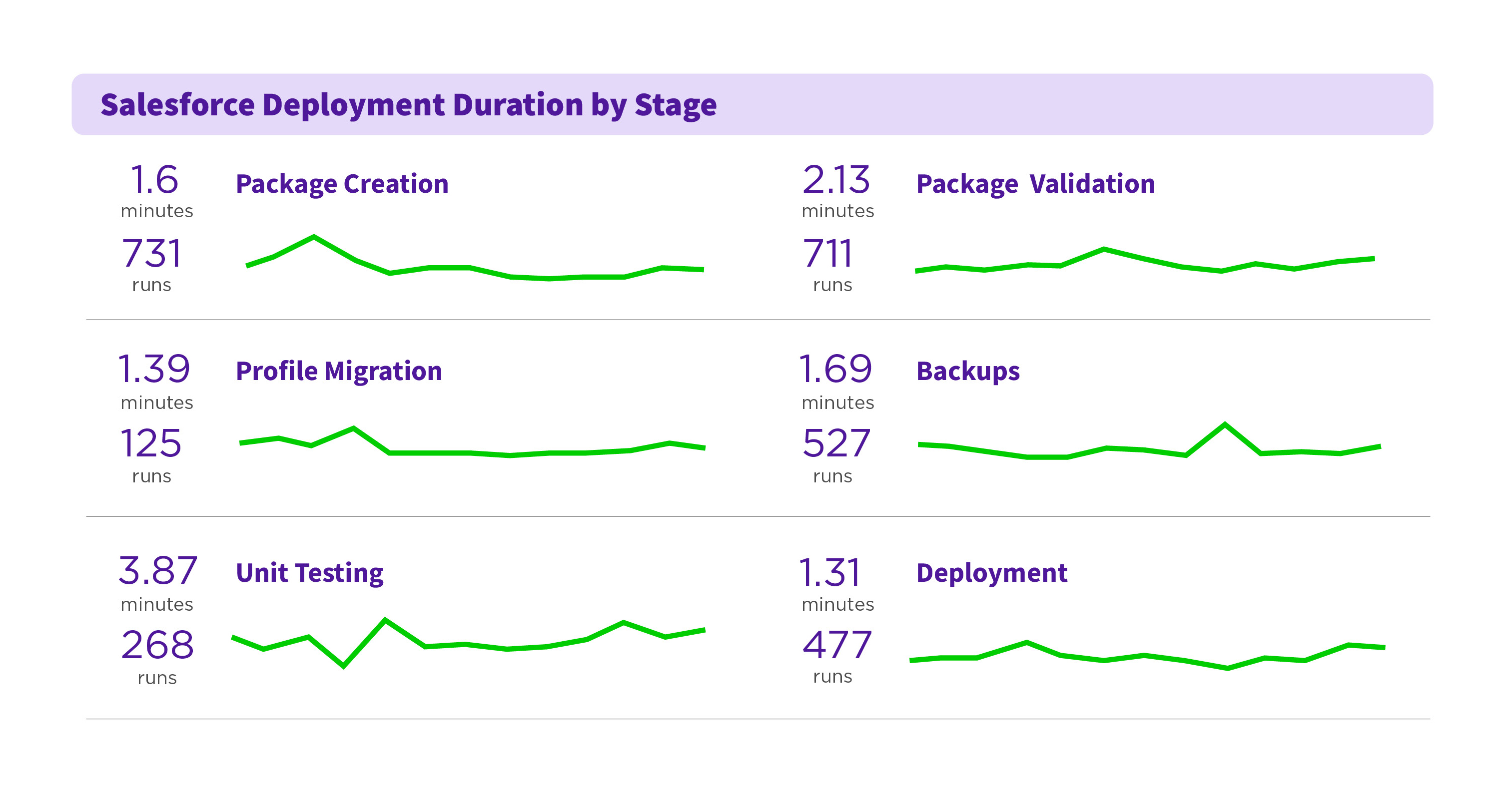 - Birds eye view of the deployment time spent on Profile related packages, provides a perspective on Profile and Permissions deployment challenges and how Opsera’s profile migration adds value by having separate pipelines for profiles.