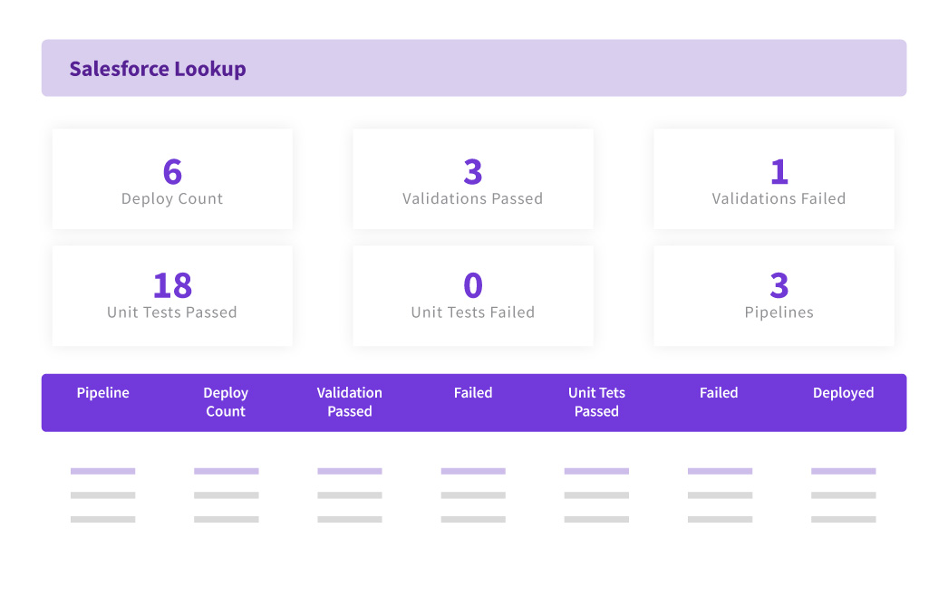 - Component lookup to pull all the deployments per metadata component deployed using salesforce. This enables the project teams to handle common components across multiple pipelines and predict future conflicts and failures.